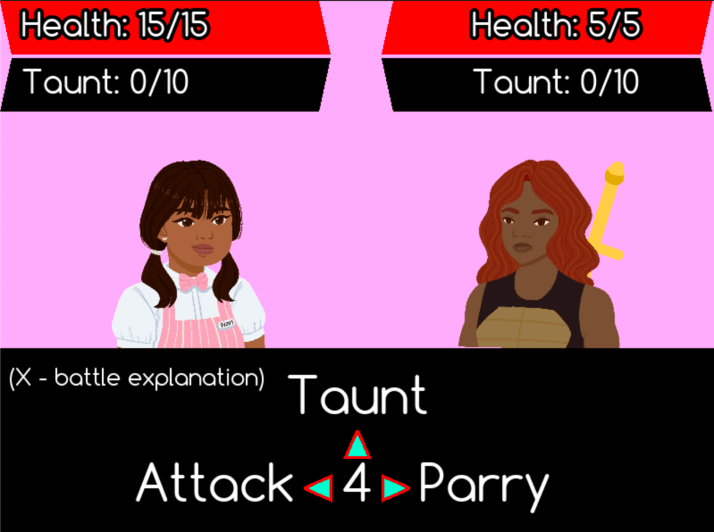 I designed the turn-based combat system, wrote the dialogue, defined the angels’ and demons’ personalities, and gave our visual artist outlines for the designs of each angel and demon.