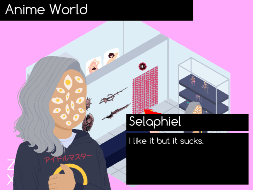 After the characters were defined, I wrote out state-based dialogue for all fourteen angels and demons as well as the game’s introductory and ending scenes. The outline of Nari and Yun’s arc was a group effort, but the angels’ and demons’ individual storylines were left to me to create. It was a fun challenge trying to make the same basic conversation structure feel unique and engaging for fourteen different characters.